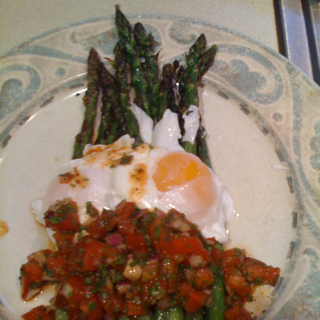 A couple of days later, I’ll toss the blanched asparagus in olive oil, lemon zest, fresh thyme, salt and pepper and I’ll finish cooking it on the grill. It picks up the smoke from the grill and gets caramelized bits on it. It will take 3 or 4 minutes to grill since it is partially cooked. I’ll use them in one of my favorite dishes, grilled asparagus with poached eggs and fresh tomato salsa.