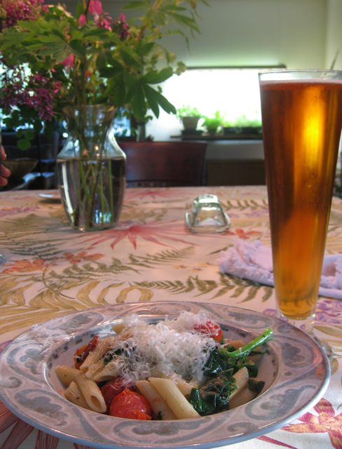 Summary: A quick pasta dish that uses cherry tomatoes and large leaf spinach.