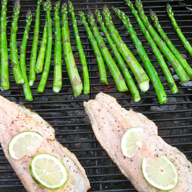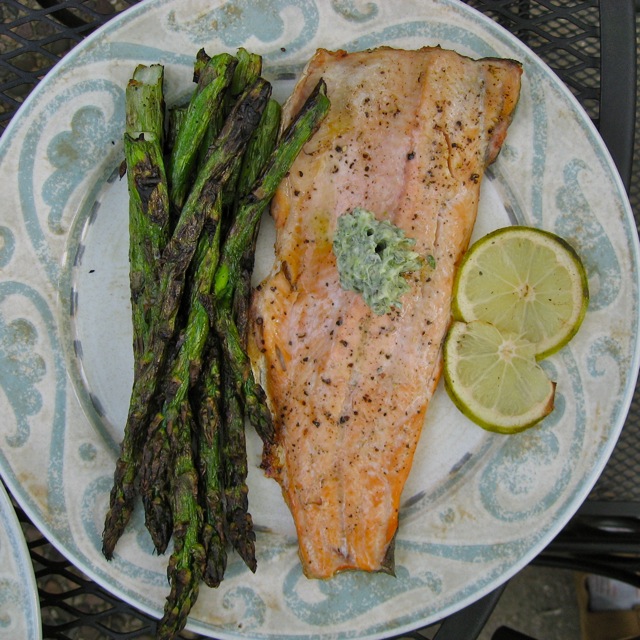 Tonight’s dinner was trout, simply prepared and grilled on the barbecue; served with a quick lime, thyme and garlic compound butter. The side dishes were grilled asparagus (easy and delicious) and oven chips.