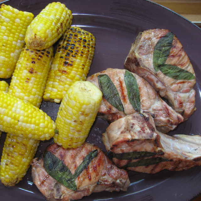 Below are grilled pork chops with sage that were brined for 2 hours. Because the chops had been brined, I could cook them over lower heat for much longer without drying them out. This let the smoke from the grill penetrate the meat. I grilled these over indirect heat (coals on the sides) turning every 5 minutes until the internal temperature was 140 F. The sage leaves pressed into each side are decorative and tasty.