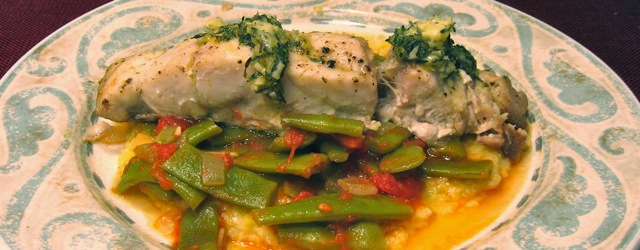 Corvina - baked and topped with compound butter - served over stewed green beans and polenta.