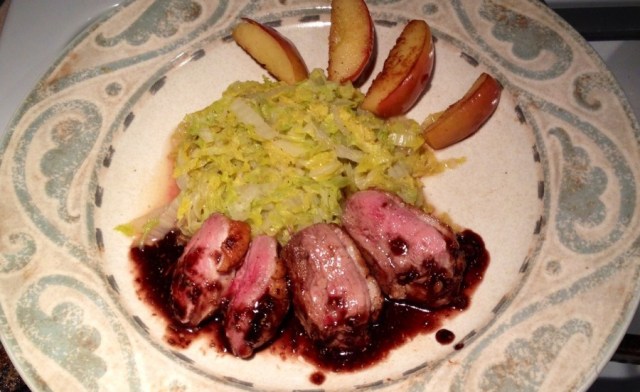 - Slice the duck breast and divide between two plates and drizzle with the pan sauce.